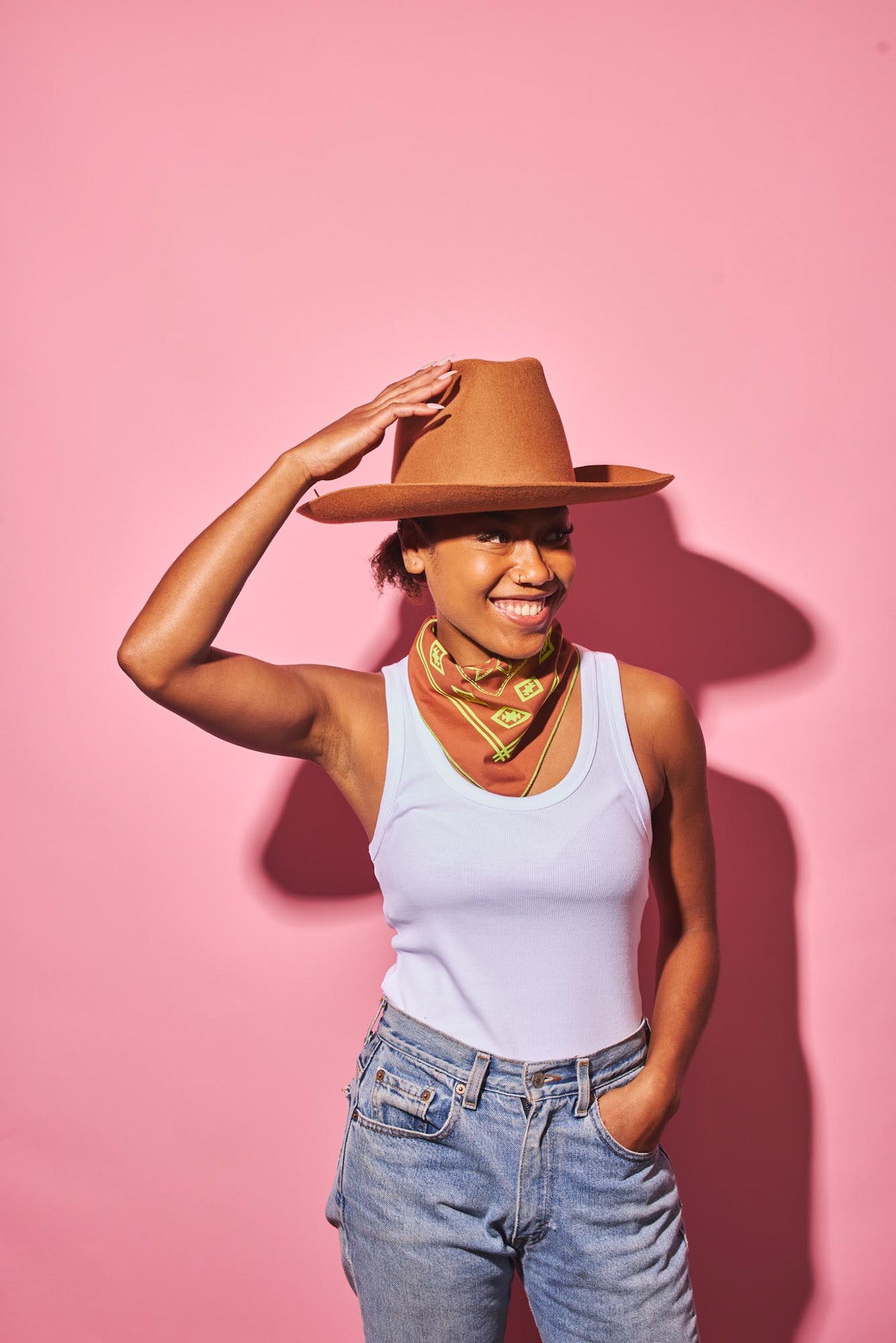 Embrace the spirit of adventure and romance with the Brown & Neon Yellow Aztec Bandana, featuring the exclusive ‘Blanket Under the Stars’ design by Megan Young. Inspired by the magical moments of watching the sun set and the night sky fill with stars in the Australian outback, this bandana invites you to carry that peaceful, romantic feeling wherever you go.