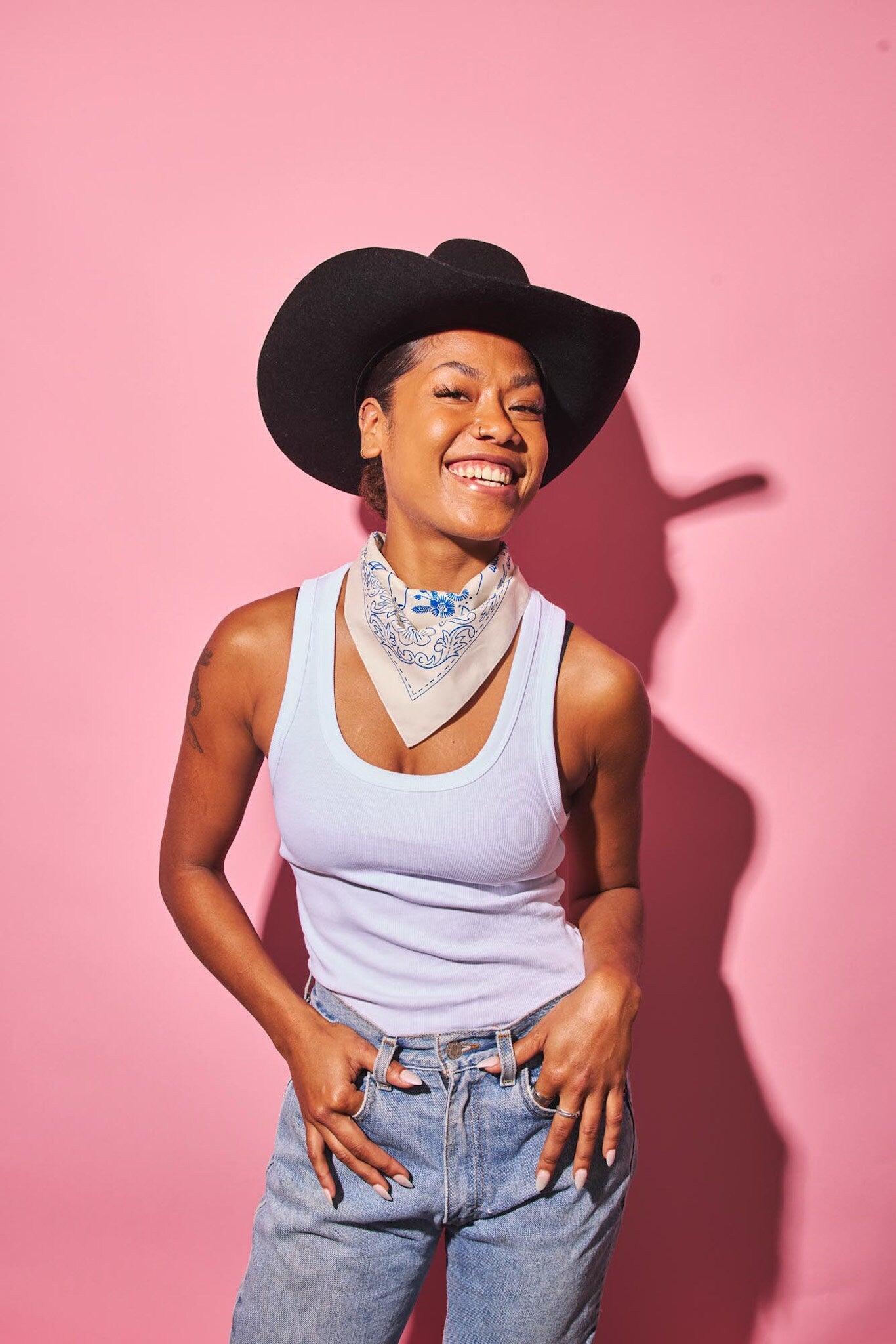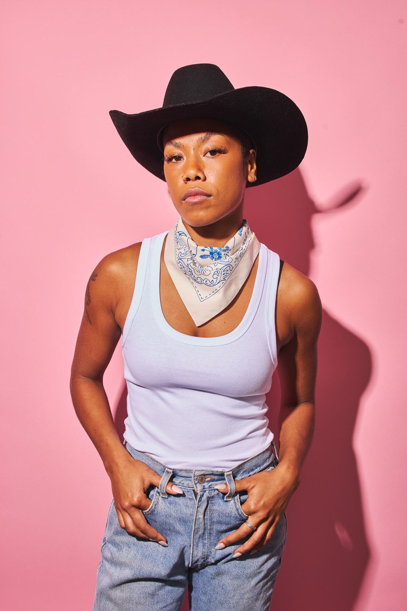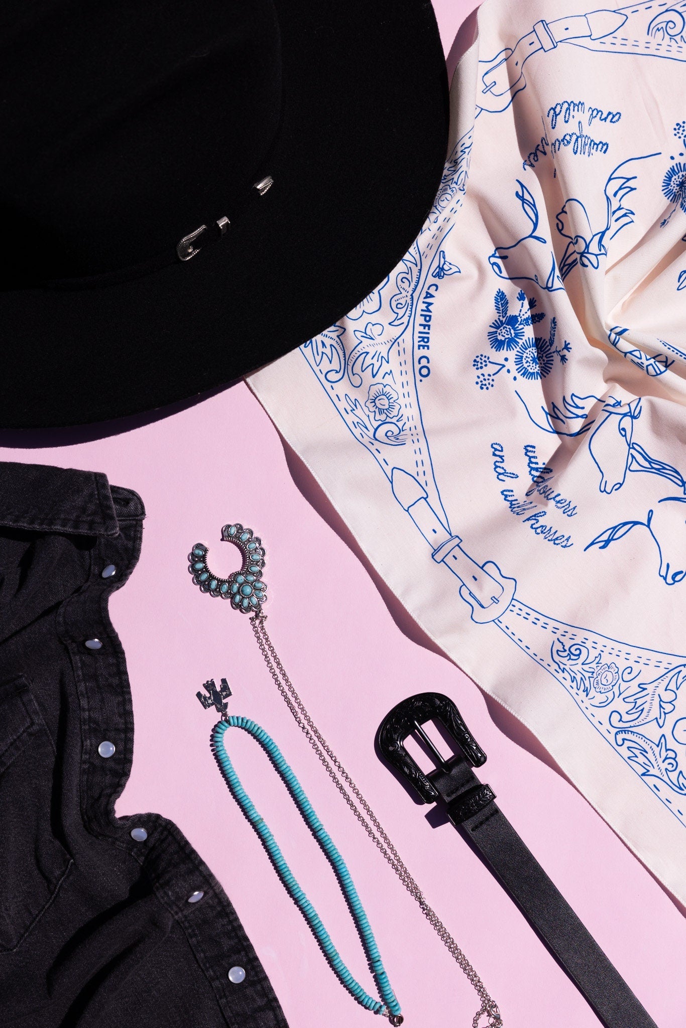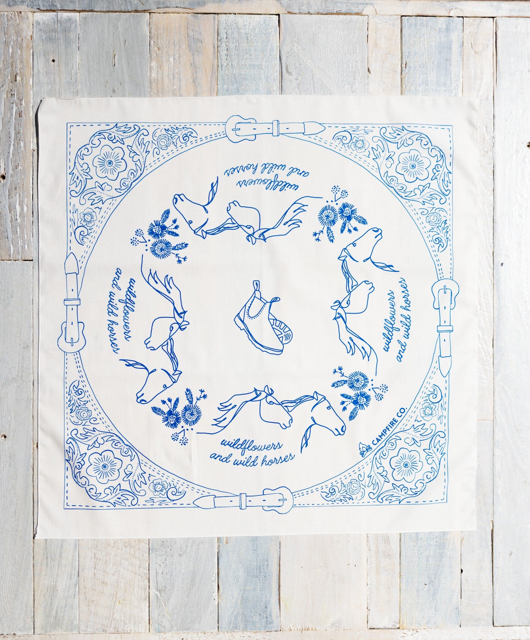 Step into timeless Western style with the Western Bandana in Ecru & Blue, featuring the exclusive ‘Wildflowers and Wild Horses’ design by Megan Young. Inspired by Lainey Wilson’s song of the same name, this bandana celebrates the spirit of country music festival lovers with its detailed depiction of tooled leather and classic Western buckles woven into the design.