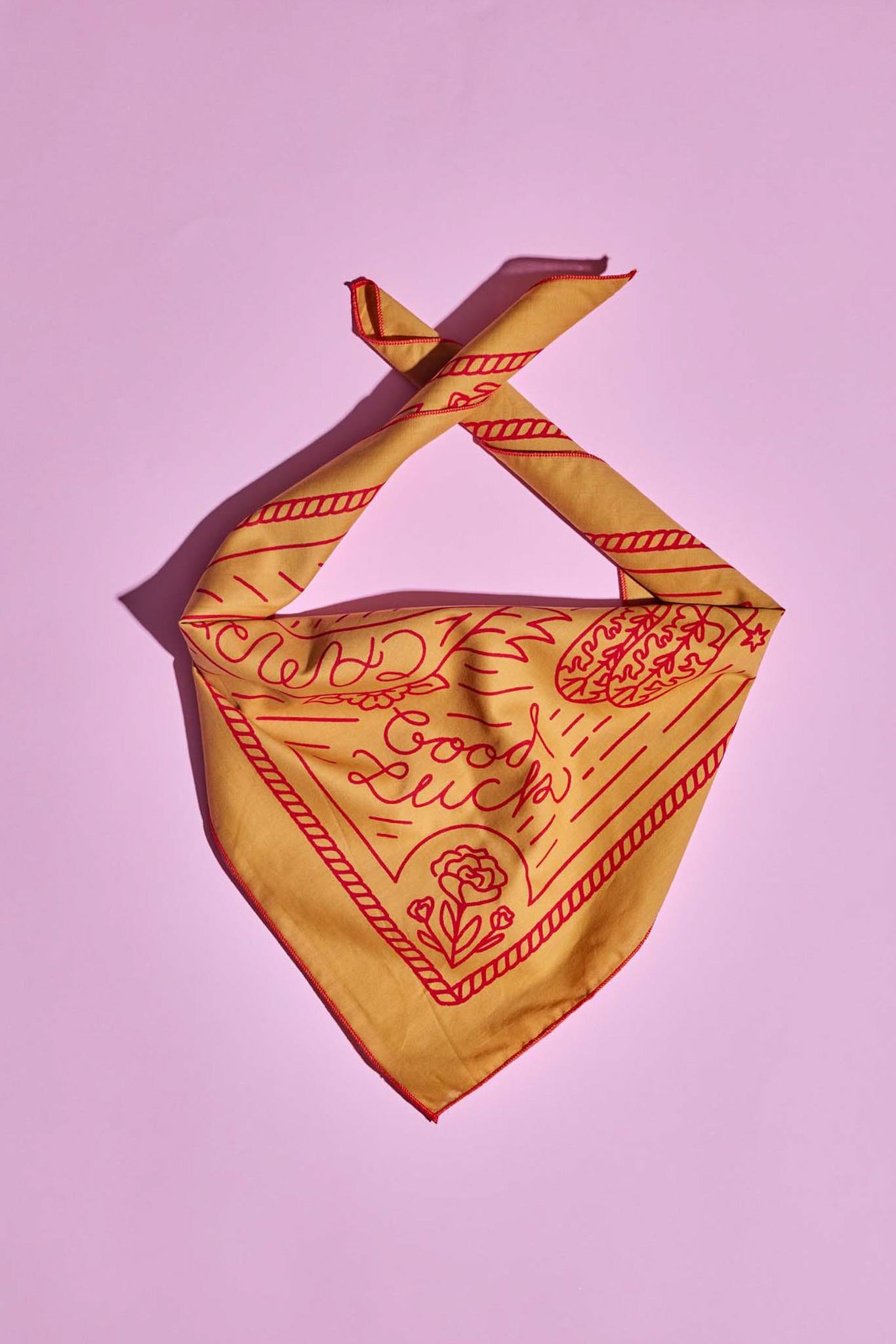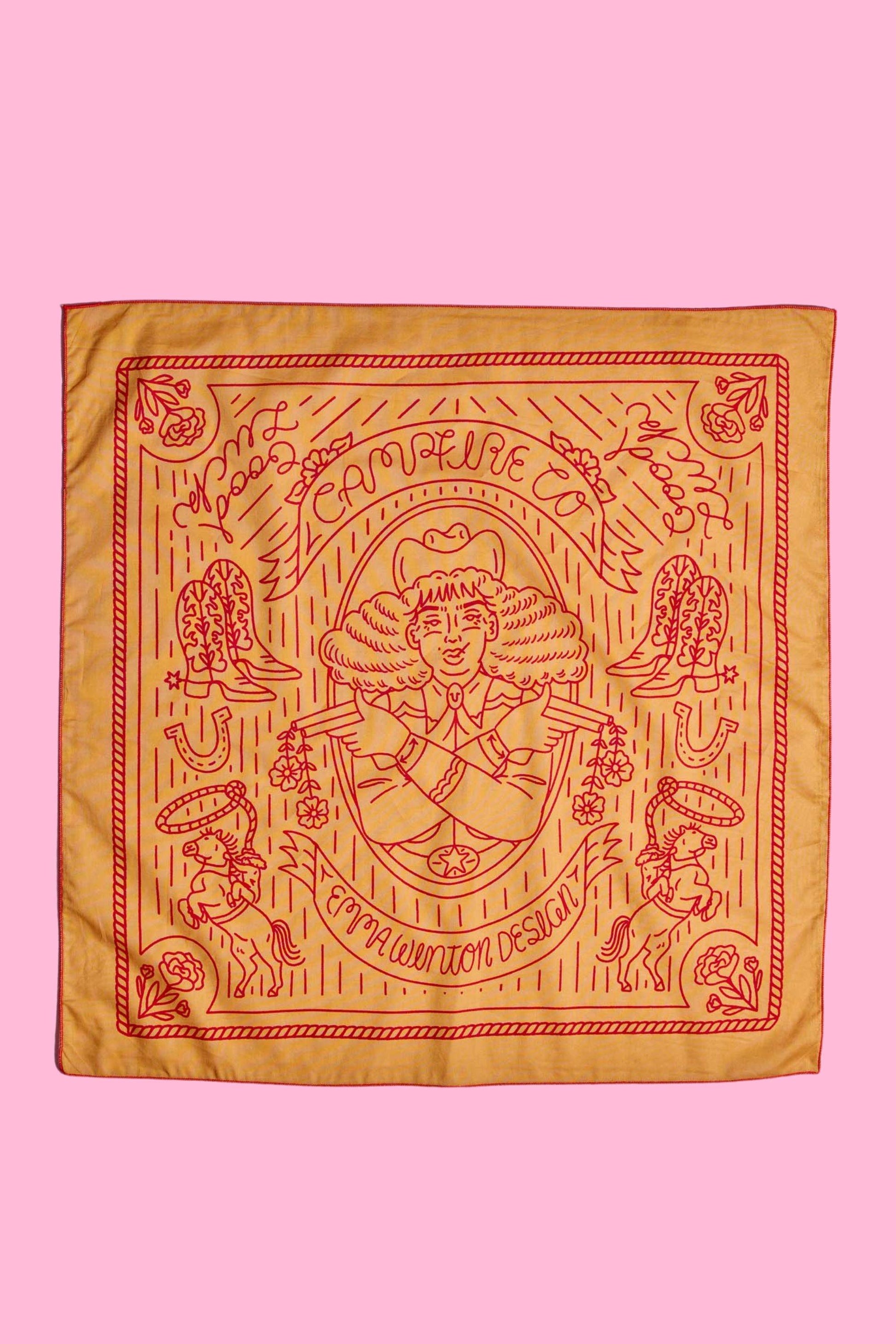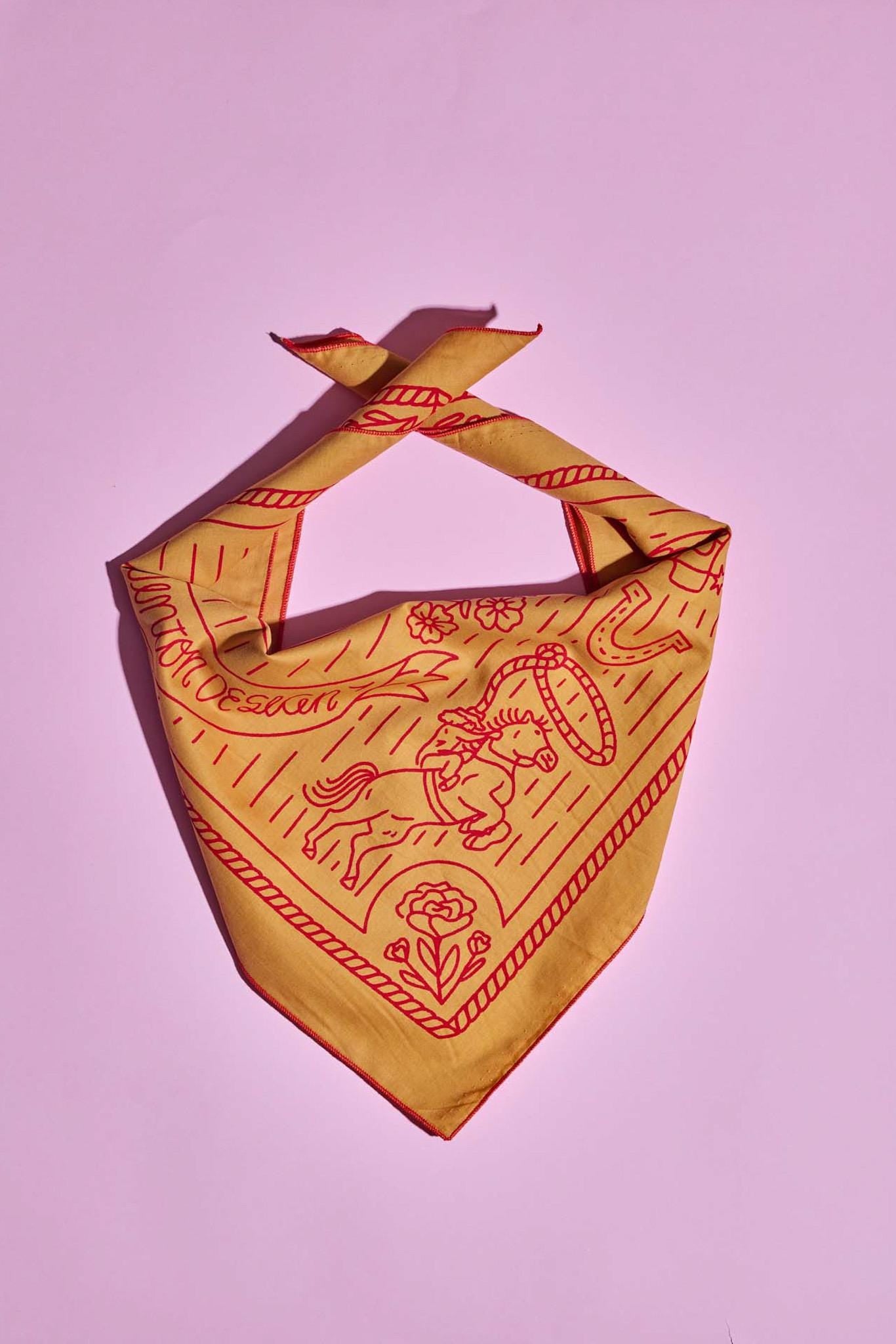 Rooted in strength, style, and Western spirit, the Cowgirl Bandana is a celebration of bold femininity and wild freedom. Designed by Melbourne/Naarm-based artist Emma Winton, this tattoo-inspired artwork features a vibrant red print on rich gold/mustard fabric, capturing the essence of the modern cowgirl—resilient, adventurous, and unapologetically herself.