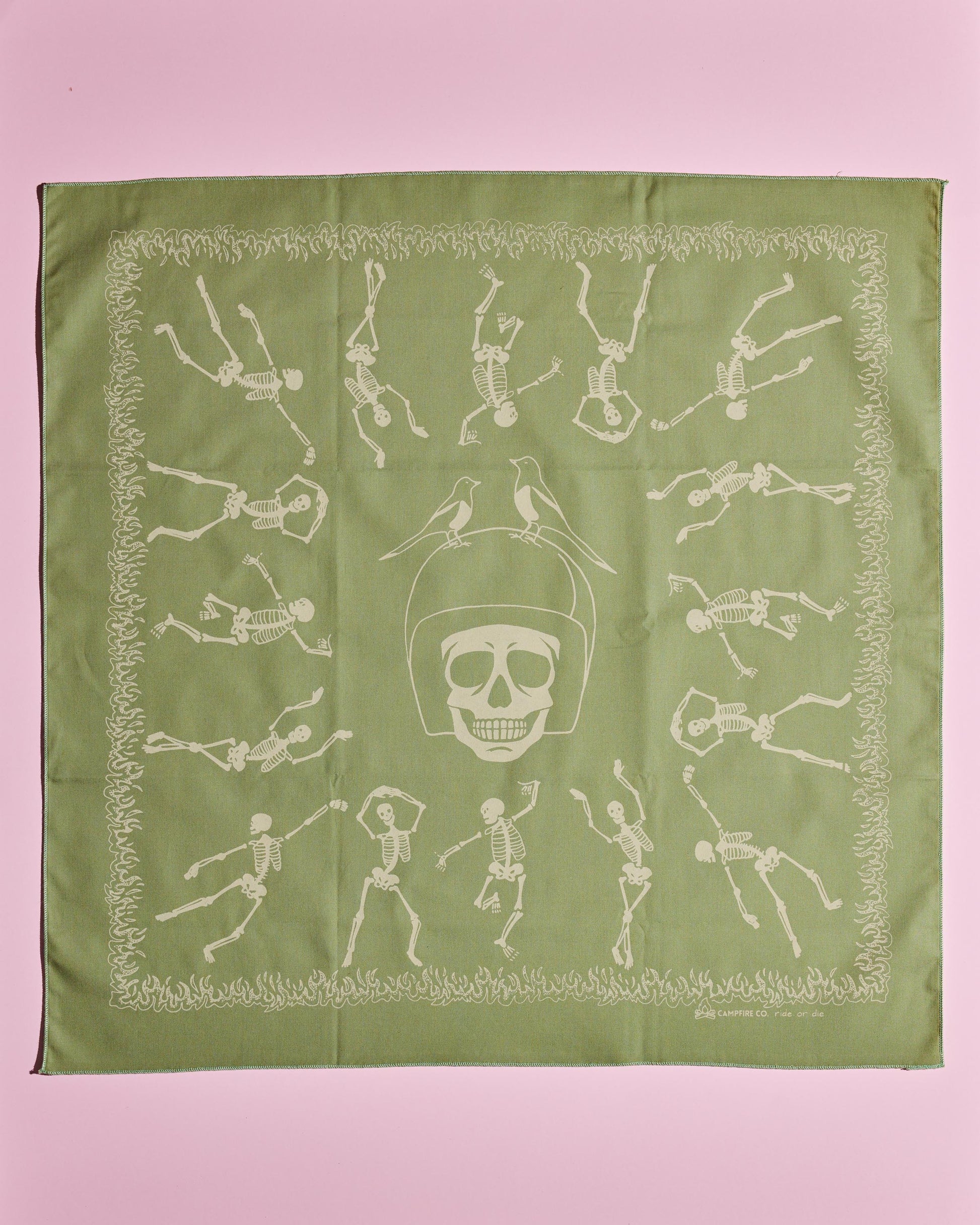 Fuel your fire with the Ride or Die Bandana, featuring an exclusive hand-drawn design by Megan Young. Inspired by the rebellious spirit of 90’s street culture, outlaw energy, and the deep symbolism of magpies, this design brings together movement, mischief, and loyalty. Fiery borders, dancing skeletons, and a central skull-with-motorcycle motif—topped with two magpies—celebrate fearlessness, freedom, and the power of sticking by your crew.