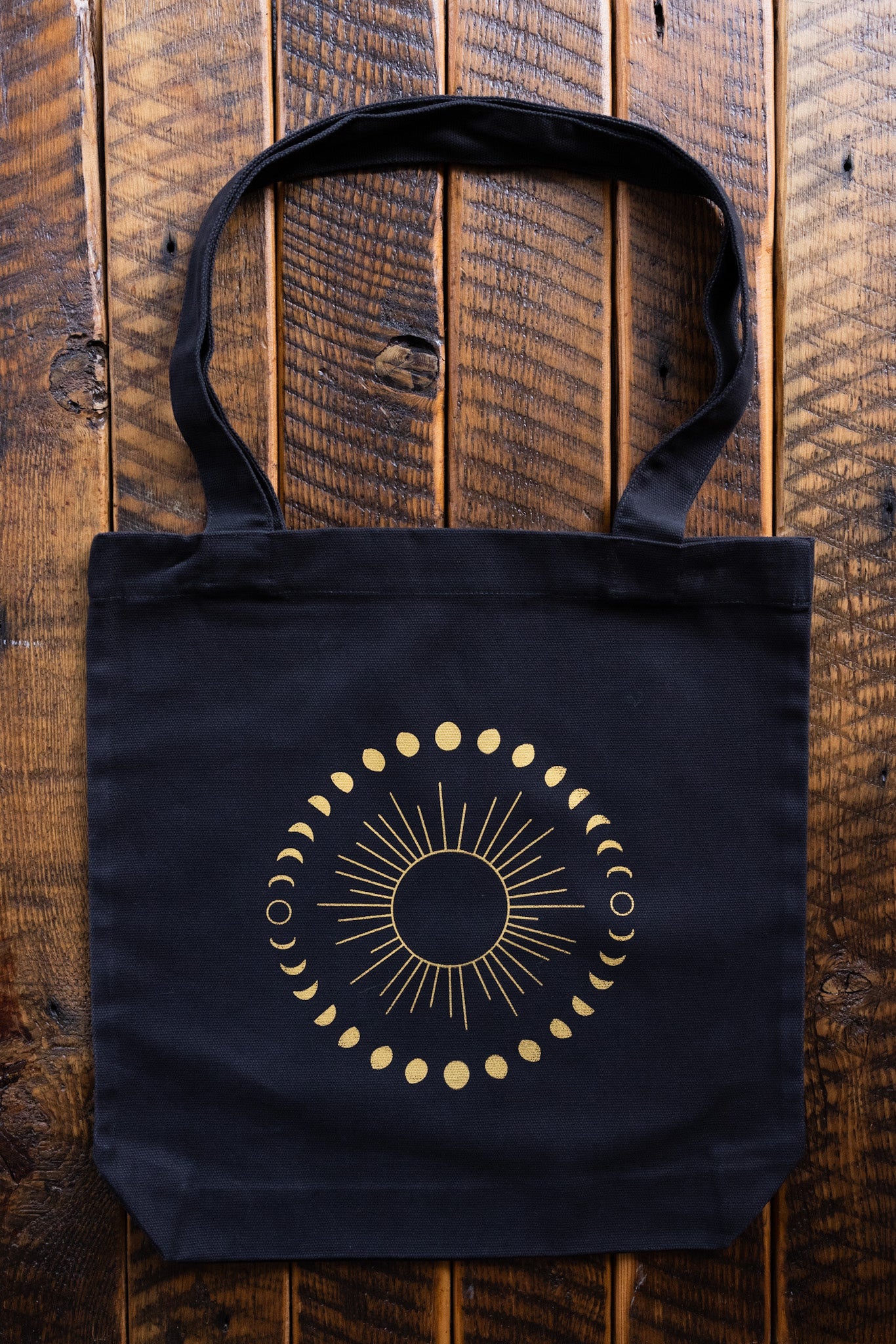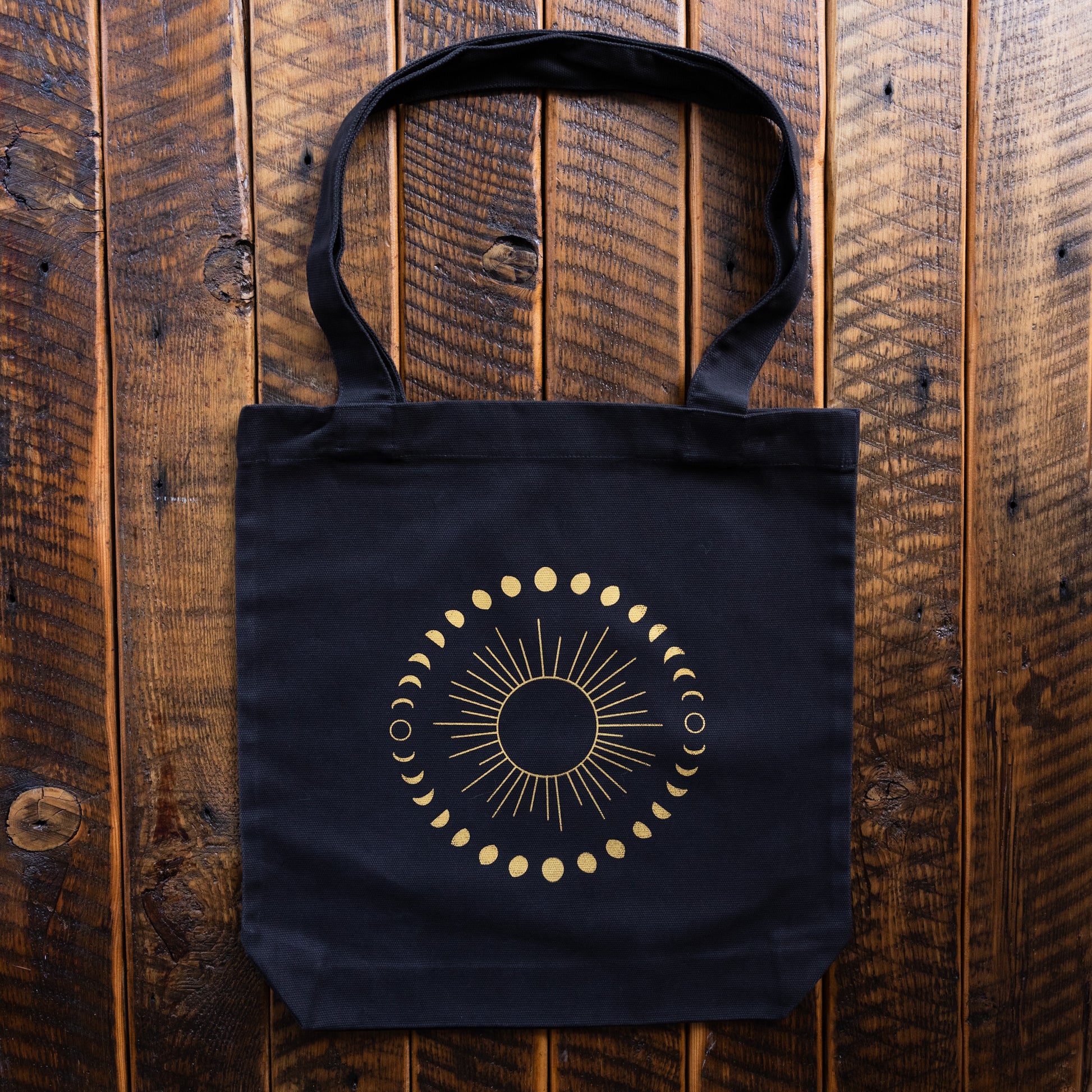 Carry the cosmos with you. The Moon Phases Tote Bag by Campfire Co. is a bold and mystical everyday essential, featuring a hand screen printed design in metallic gold that captures the sun and full lunar cycle — from new moon to full moon and back again.