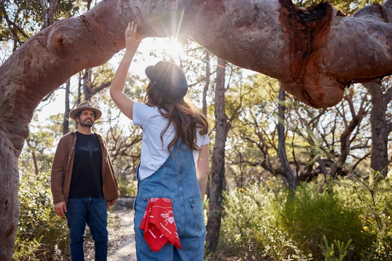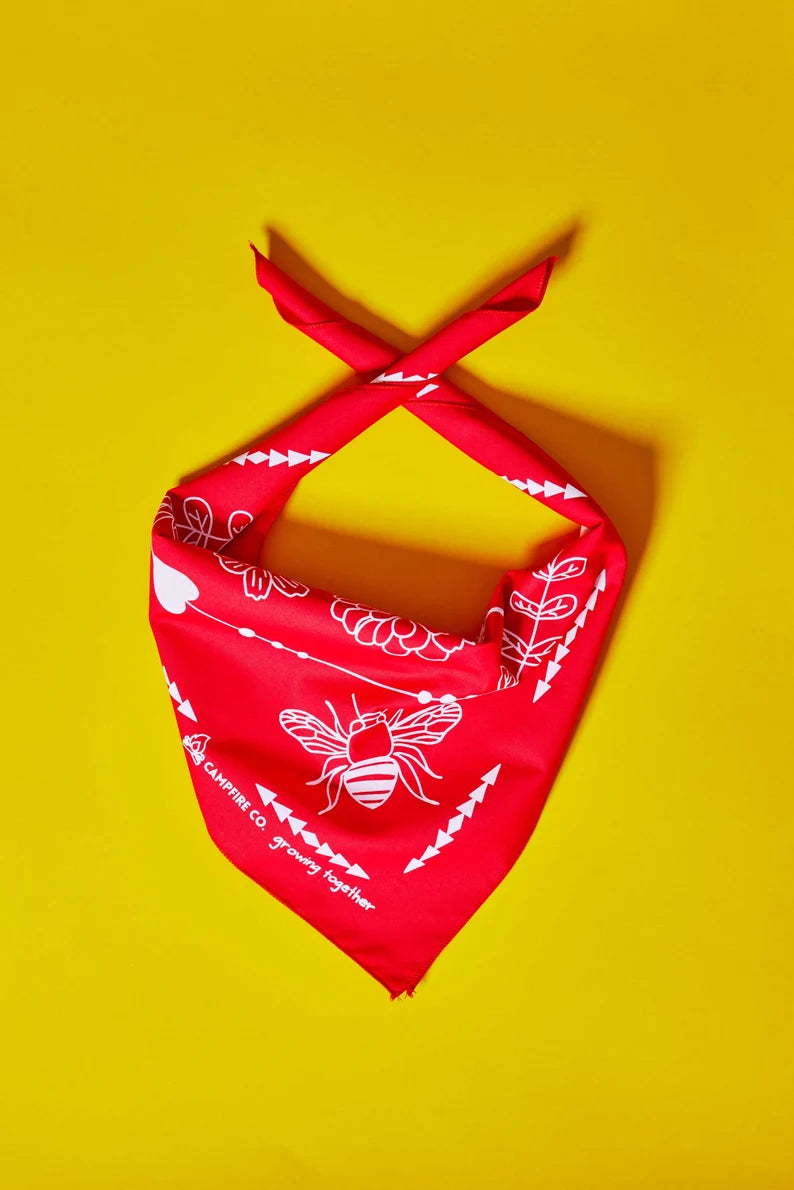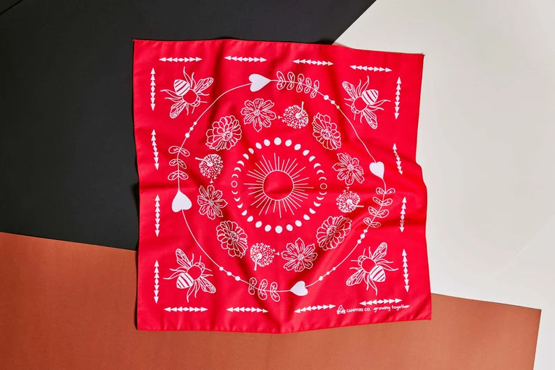 The Growing Together Bandana is a celebration of nature, designed to inspire connection with the land and growing your own food. Made from soft, breathable 100% cotton in a rich red shade, this bandana features a detailed permaculture-inspired print including the sun, moon phases, seed cycles, pollinator-friendly flowers, and the iconic native Australian blue-banded bee.