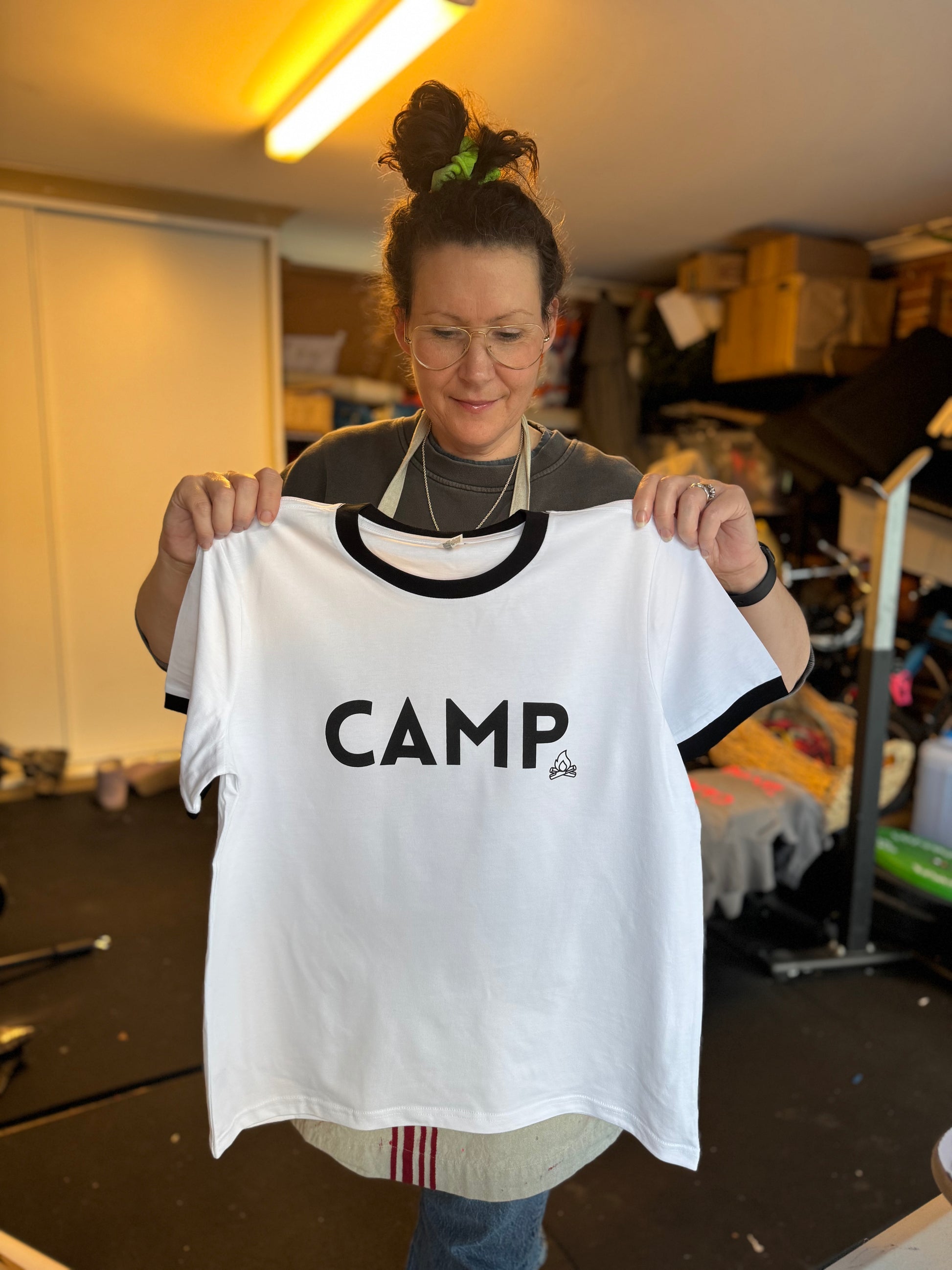Crafted with care, each shirt is hand screen printed with a striking black graphic that reads "CAMP" alongside our signature campfire logo – a nod to starry nights, smoky fires, and stories told under the sky. Whether you're hiking trails, roasting marshmallows, or just chasing weekend freedom, this tee says you were made for the wild.